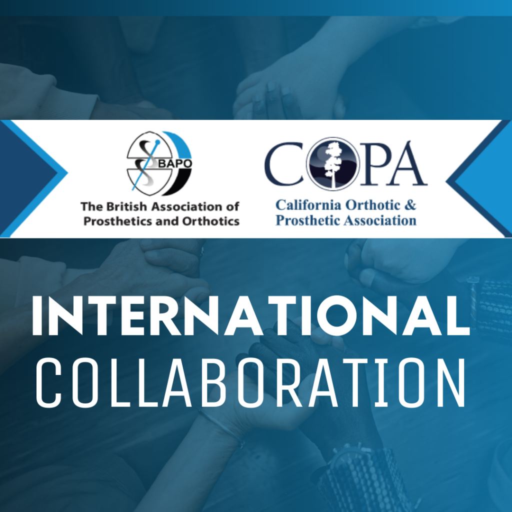 The British Association of Prosthetics and Orthotics (BAPO) and the California Orthotic & Prosthetic Association (COPA) are pleased to announce a new collaboration aimed at raising the visibility of the prosthetic and orthotic profession globally. The collaboration brings together two leading organisations to address shared challenges, promote innovation, and champion the vital work the prosthetic and orthotic profession provides for our service users.